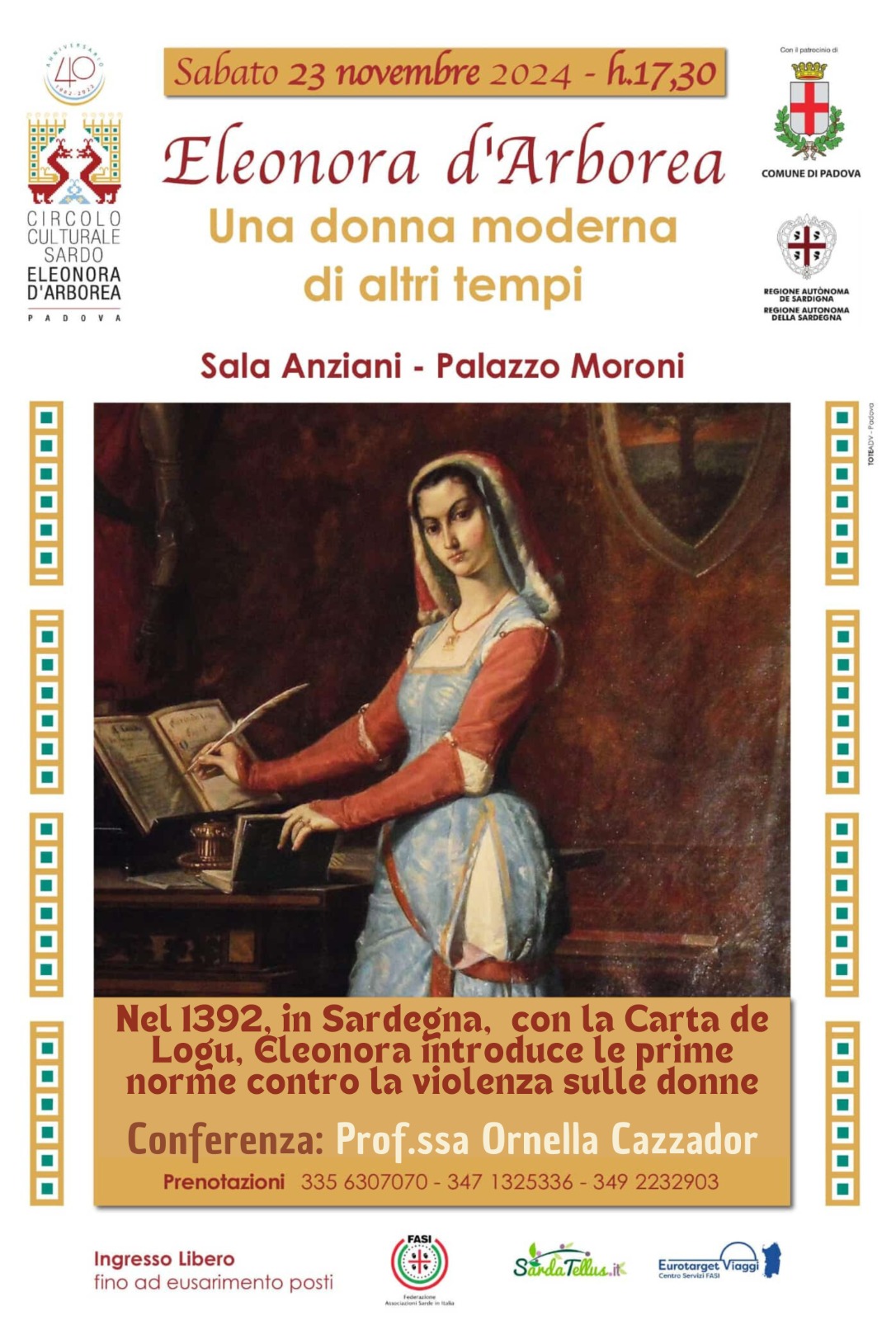 La Prof.ssa Ornella Cazzador ci farà conoscere a fondo Eleonora d’Arborea nella conferenza che terrà presso la sala Anziani nel Palazzo Moroni, sede del Comune di Padova, sabato 23 novembre 2024, alle ore 17,30.