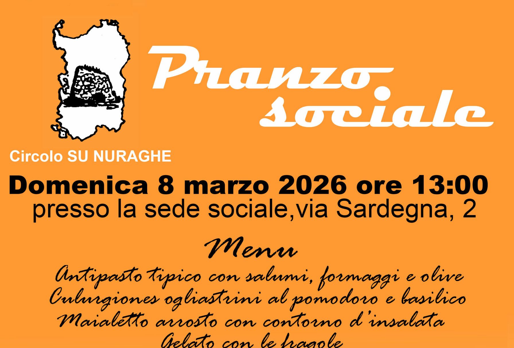 Il menù è interamente pensato per ritrovare sapori della Sardegna. Si partirà dall’ antipasto tipico, con salumi, formaggi e olive. Il primo sarà costituito da culurgiones ogliastrini al pomodori e basilico.A seguire maialetto arrosto con contorno d’insalata e gelato con le fragole, acqua e vino. Il tutto al costo di 30€ per i soci, 35€. per gli amici. Sconto del 50% per i bambini.