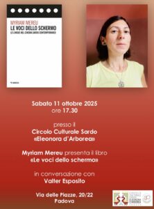 La monografia di Myriam MereuLe voci dello schermo ci consentirà di conoscere anche diversi luoghi della Sardegna, Barbagia, Campidano, Sulcis, Trexenta e le lingue del cinema sardo Contemporaneo.