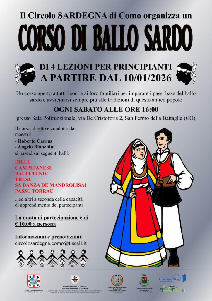 Il Circolo Sardegna di Como organizza un corso di ballo sardo per principianti aperto a tutti i Soci/e, parenti e simpatizzanti che si articolerà su 4 lezioni durante le quali i maestri Roberto Carrus e Angelo Bianchini insegneranno i passi base dei più diffusi balli tradizionali della Sardegna.