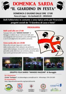 Il Circolo Culturale Ricreativo “Sardegna” di Como e l’Associazione “Il Giardino di Luca e Viola”, hanno organizzato, all’interno dell’evento “Il giardino in Festa” che prevede numerose iniziative nel periodo compreso tra il 01/06/24 e il 08/06/24, un appuntamento totalmente dedicato alla Sardegna.