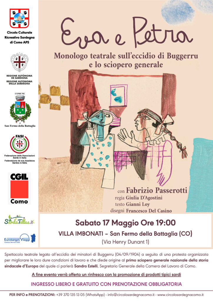 Sabato 17 maggio 2025 alle ore 19:00, presso la suggestiva cornice di Villa Imbonati, in via Henry Dunant 1 a San Fermo della Battaglia (Como), il Circolo Culturale Ricreativo Sardegna di Como APS ha organizzato un evento di grande importanza storica e culturale, una rappresentazione teatrale dal titolo “Eva e Petra”, legata all’eccidio dei minatori di Buggerru del 4 settembre 1904.