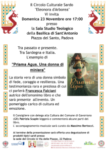 Di Priama Agus, una donna sarda di miniera ci parlerà Francesca Falciani nella Sala Studio Teologico della Basilica di Sant’Antonio (domenica 23 novembre ore 17,00).