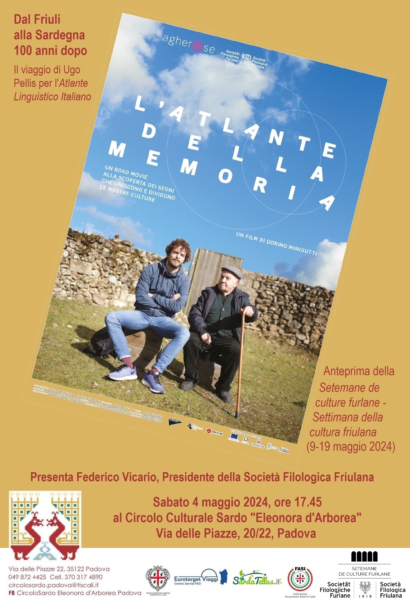 Questo interessante evento nasce dall’incontro, realizzato per il tramite del ricercatore dell’Università di Padova, Franco Benucci, fra il Circolo di Padova “Eleonora d’Arborea” e la Società Filologica Friulana che ha celebrato il centenario della sua fondazione con questo film prodotto da Agherose.