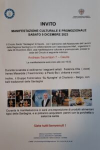 Il Circolo Sardo “Sardegna” di Geulle-Olanda, organizza con il patrocinio della Regione Sardegna e in collaborazione con l’Aitef di Cagliari, una manifestazione culturale e promozionale. Alla manifestazione parteciperanno musicisti sardi e il gruppo folk di Charleroi-Belgio La presidentessa Gabriela Sedda invita tutti a partecipare alla manifestazione, che si terrà nella nuova sede del Circolo: Andreas […]