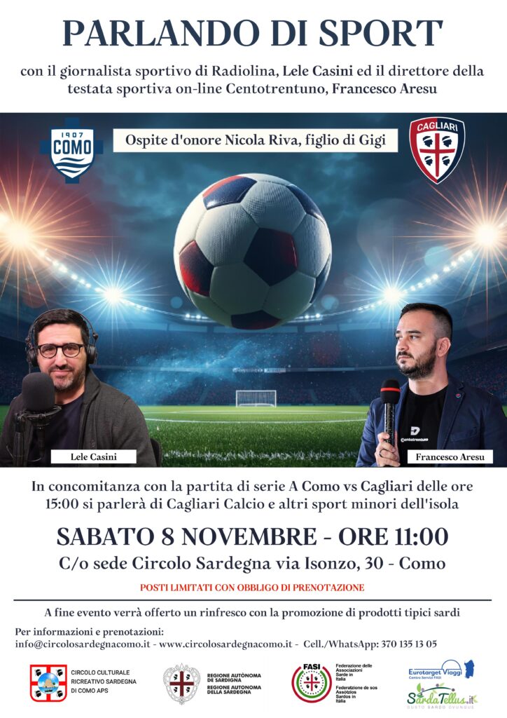 Presso la sede del Circolo Sardegna in Via Isonzo 30 a Como, si terrà un incontro dedicato al mondo dello sport che vi accompagnerà verso il cuore della sfida calcistica tra Como e Cagliari, in programma alle ore 15:00 dello stesso giorno.