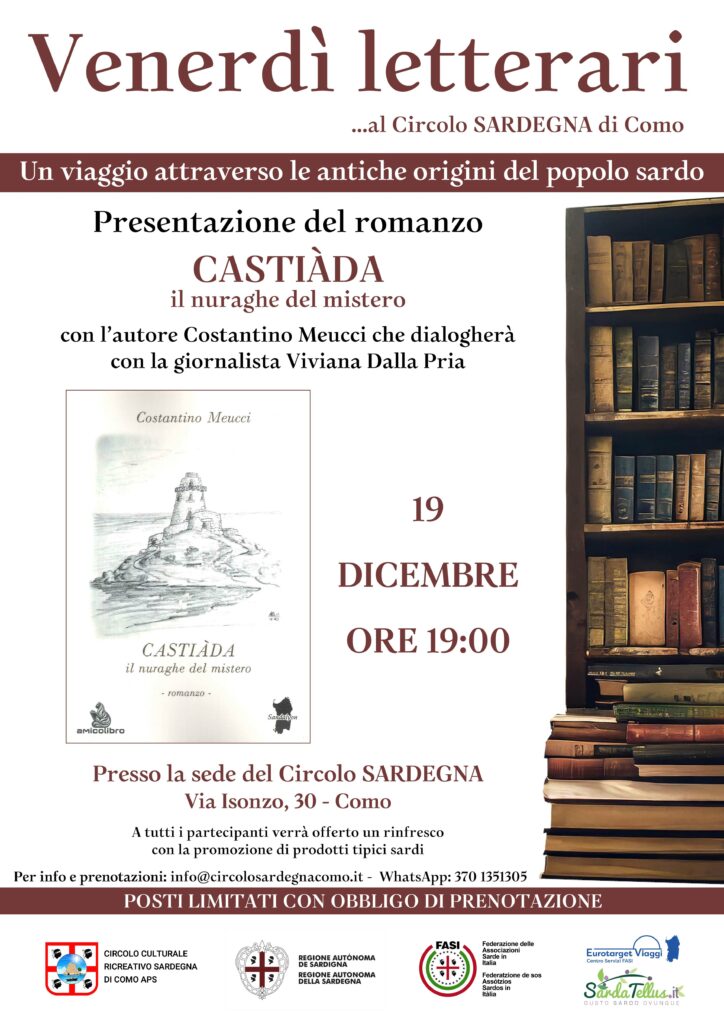 Venerdì 19 dicembre presso la sede del Circolo SARDEGNA in via Isonzo 30 a Como verrà presentato, in compagnia dell’autore e della giornalista Viviana Dalla Pria, il romanzo di Costantino Meucci, “CASTIÀDA – il nuraghe del mistero” che raccoglie una avvincente storia che si svolge in un sito nuragico nel sud della Sardegna, dove l’archeologa Adriana Fantoni dà vita a una campagna di scavi che rivela non solo vestigia antiche, ma anche segreti sepolti forse non così lontani.