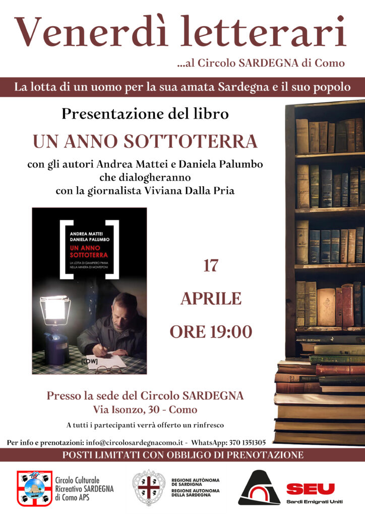 Venerdì 17 aprile alle ore 19:00 presso la sede del Circolo SARDEGNA in via Isonzo 30 a Como verrà presentato, in compagnia degli autori Andrea Mattei e Daniela Palumbo e della giornalista Viviana Dalla Pria il libro “UN ANNO SOTTOTERRA” che ci consentirà di parlare dell’incredibile lotta di un uomo amante della Sardegna e della sua gente.